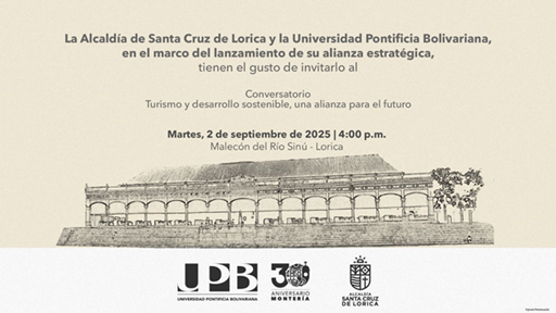 En el marco del lanzamiento de la alianza estratégica entre la Alcaldía de Santa Cruz de Lorica y la Universidad Pontificia Bolivariana seccional Montería queremos extenderle una cordial invitación para que nos acompañe en el conversatorio titulado "Turismo y desarrollo sostenible, una alianza para el desarrollo" Este evento se realizará el próximo martes, 2 de septiembre de 2025 a las 4:00 pm en el malecón del Rio Sinú – Lorica.